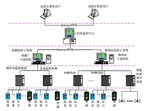 系統(tǒng)提供的換熱站的自控系統(tǒng)由上位機(jī)(監(jiān)控中心)、下位機(jī)(現(xiàn)場控制層)、通訊網(wǎng)絡(luò)等組成。
